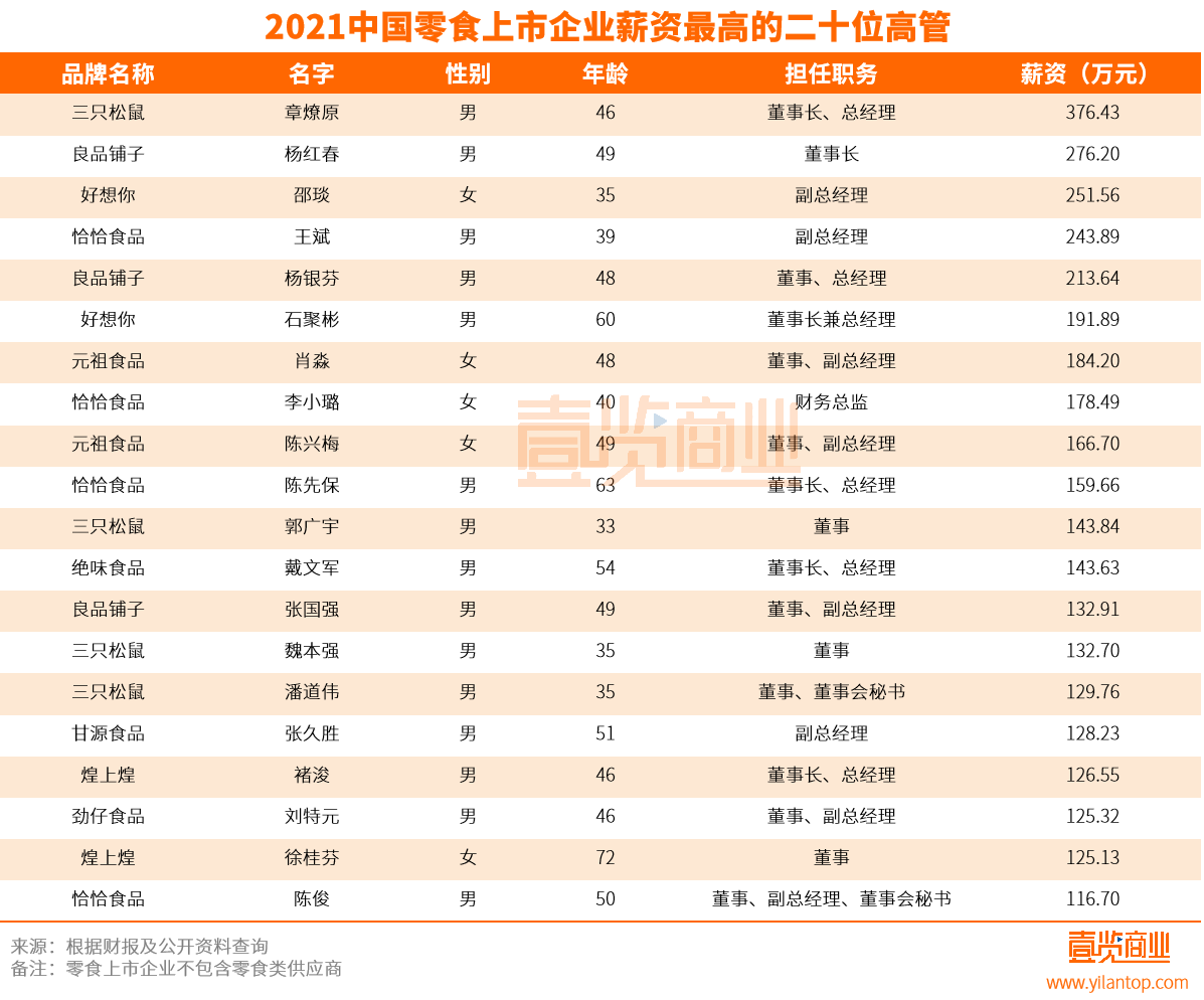 值得一提的是,高管薪酬排行前五名的有两名来自于良品铺子,而刚刚良品铺子还在人均员工薪水排名倒数前三名的榜单。