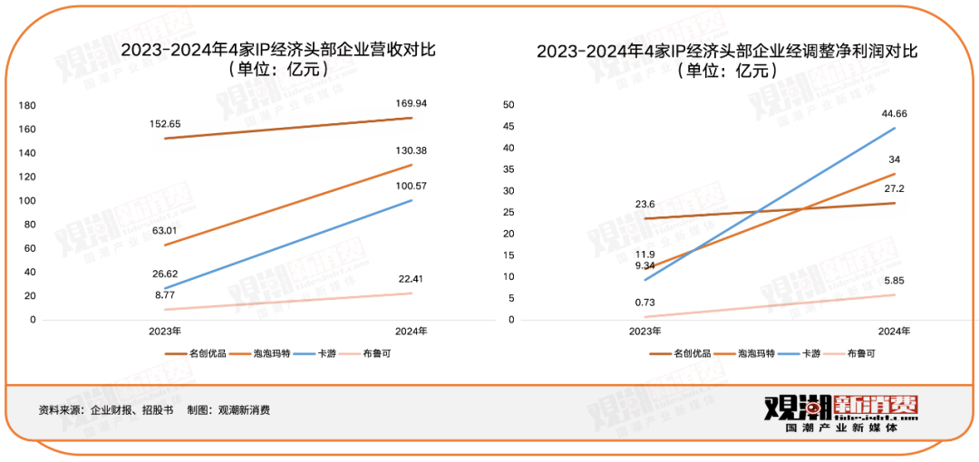 仅2024年一年时间,卡游在营收层面追上了IP生意领域的名创优品与盲盒潮玩领域的泡泡玛特,同样凭借奥特曼IP成为上市公司的布鲁可瞬间就被远远甩在身后。而在净利润层面,几位“老大哥”都不是卡游的对手。