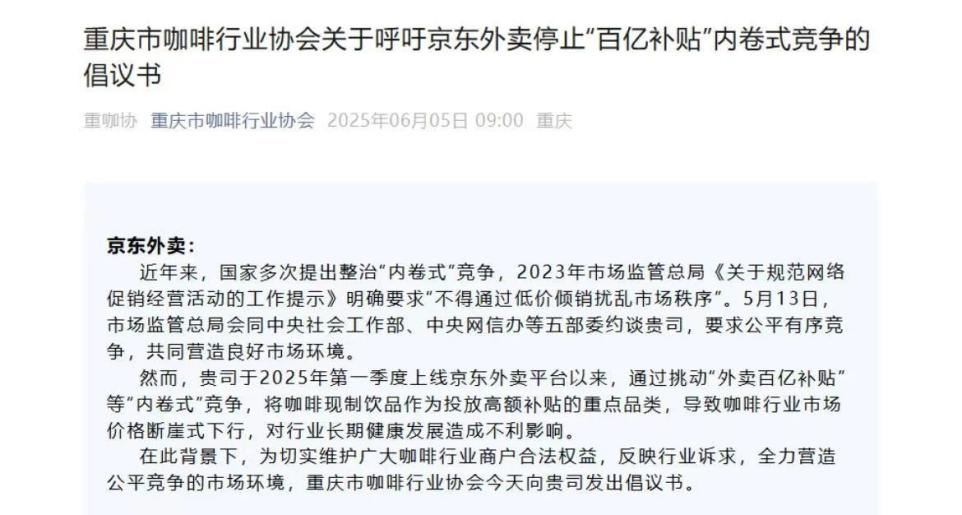 就在昨天,重庆咖啡行业协会(以下简称重咖协)发布倡议书,公开喊话带头补贴的京东外卖。