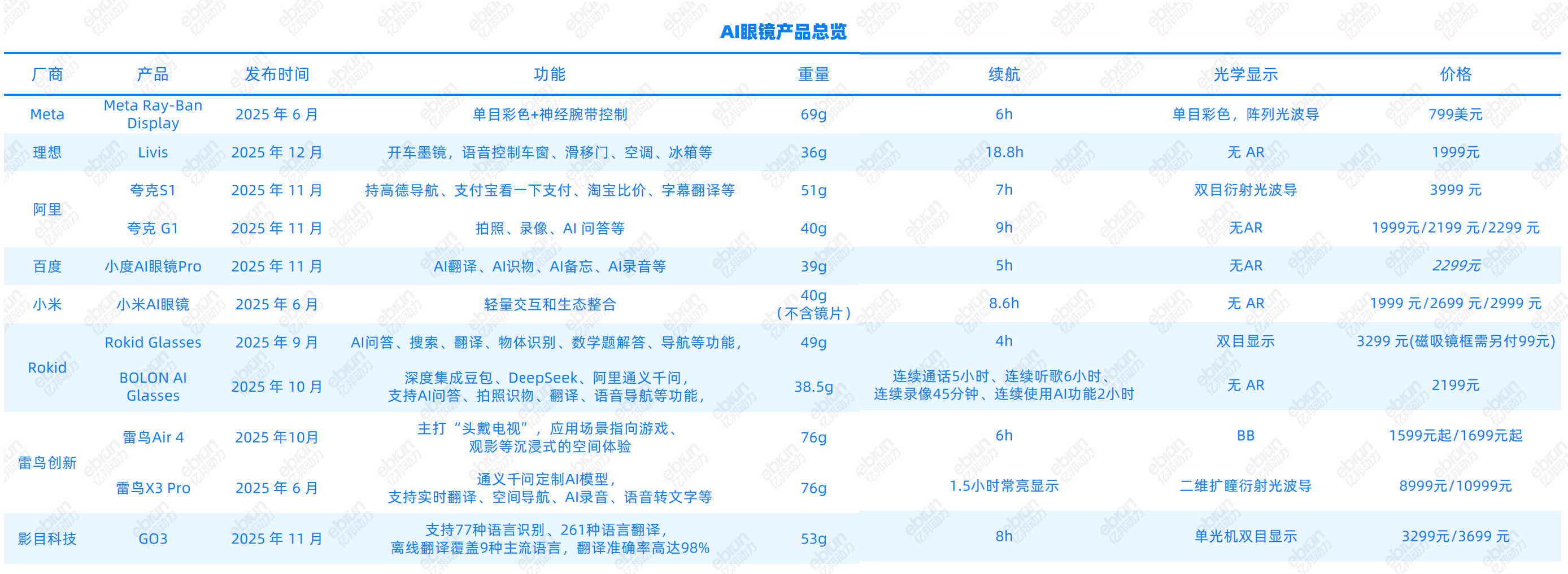这些眼镜外观类似普通黑框眼镜,重量在39克~50克之间,比近视眼镜(20g-25g)略重,普遍配有摄像头、麦克风、扬声器,搭载大模型和AI助手,可以录音录像、拍照识物,续航6h-8h。价格则500-8000元不等,有无AR设备成为价格分水岭,无AR的AI眼镜价格在500-2000元不等,单目AR眼镜价格2000元以上,双目AR眼镜价格3000元以上。