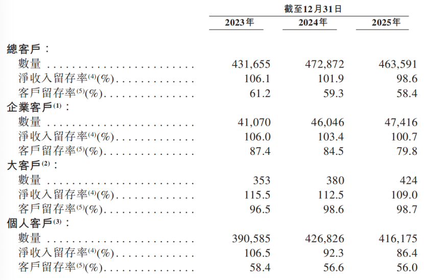 过去几年,虽然公司营收保持增长,但增速已有所放缓。在房地产及家装行业整体承压的背景下,其核心业务的扩张空间受到一定限制。与此同时,作为SaaS公司关键指标的客户留存率亦出现下滑:总客户留存率由2023年的61.2%降至2025年的58.4%,净收入留存率则从106.1%下降至98.6%,已跌破100%。这意味着,在不依赖新增客户的情况下,公司存量客户贡献的收入已出现收缩。